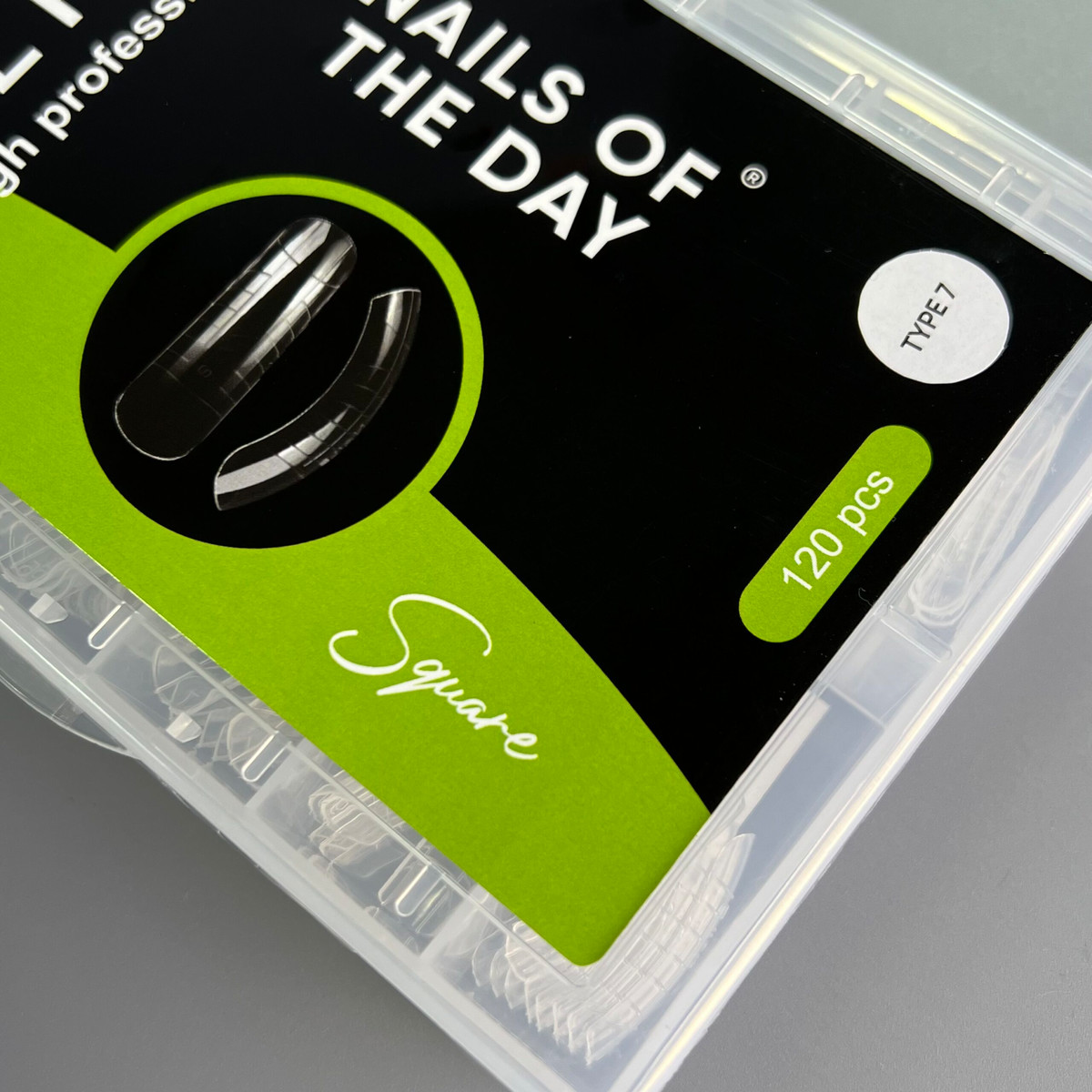 Type 7 — квадрат для середньої довжини нарощення ,підходить для зростаючих вниз нігтів, 120 штук. У наборі 120 штук — 12 розмірів, що дозволяє легко підібрати необхідну форму для будь-якої нігтьової пластини.