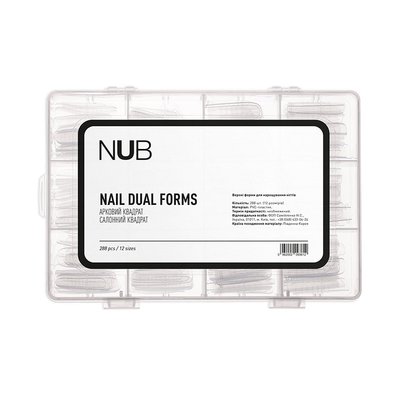 NUB Nail Dual Forms - верхні форми для нейл-нарощування. Є багаторазовими універсальними шаблонами, виготовленими з високоякісного PVC-пластику. Використовуються в нарощуванні та зміцненні нігтів салонних форм.