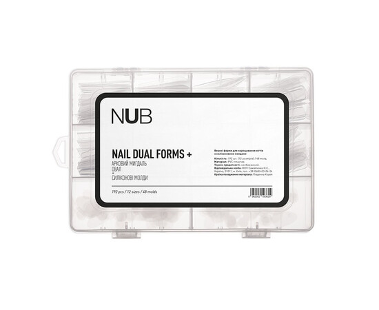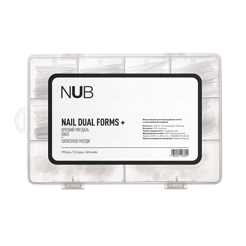 NUB Nail Dual Forms - верхні форми для нейл-нарощування. Є багаторазовими універсальними шаблонами, виготовленими з високоякісного PVC-пластику. Використовуються в нарощуванні та зміцненні нігтів салонних форм.