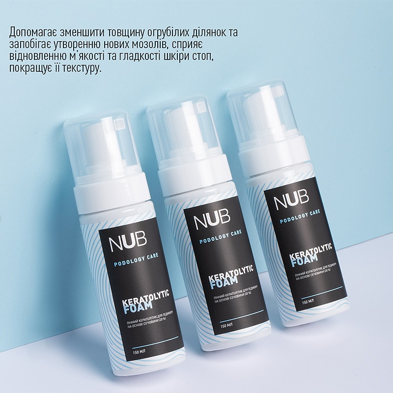 NUB Podology Care Keratolytic Foam - пінний кератолітик для педикюру та найбільш універсальний засіб лінійки. Містить 20% сечовини для активного пом'якшення огрубілостей. Завдяки легкій пінній консистенції рівномірно наноситься на шкіру стоп, обволікаючи всі проблемні зони та забезпечуючи ефективний вплив.