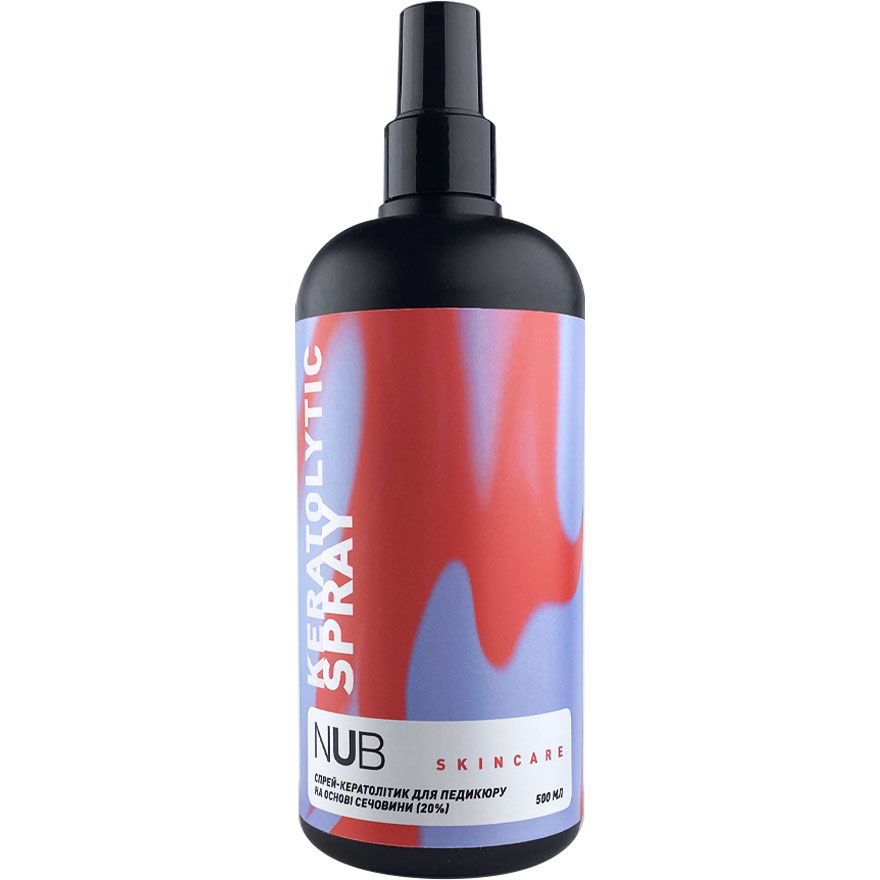 NUB Skincare Keratolytic Spray – спрей-кератолітик з січовиною 20%. Призначень для педикюру. Здатний повернути шкірі стоп гладкість, естетичність та здоров'я. Розроблень для легкого, швидкого та якісного усунення мозолів, натоптишів. Має безпечну формулу на основі січовини, тому ефективно пом'якшує та буквально розчиняє ороговілості, значно покращує вигляд та стан проблемних ділянок, допомагає позбутися виражених огрубілостей, відлущує відмерлий епітелій.