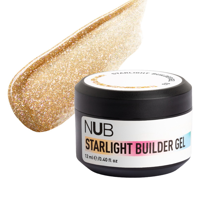 NUB Starlight Builder Gel - моделюючий гель, який має світловідбивний ефект і містить красивий кольоровий пігмент. Є сучасним матеріалом з високою міцністю та розкішним сяйвом. Завдяки спеціальним світловідбивним частинкам робить нігті яскравими, наповнює манікюр неймовірними глітерними переливами, які максимально проявляються у променях світла.
