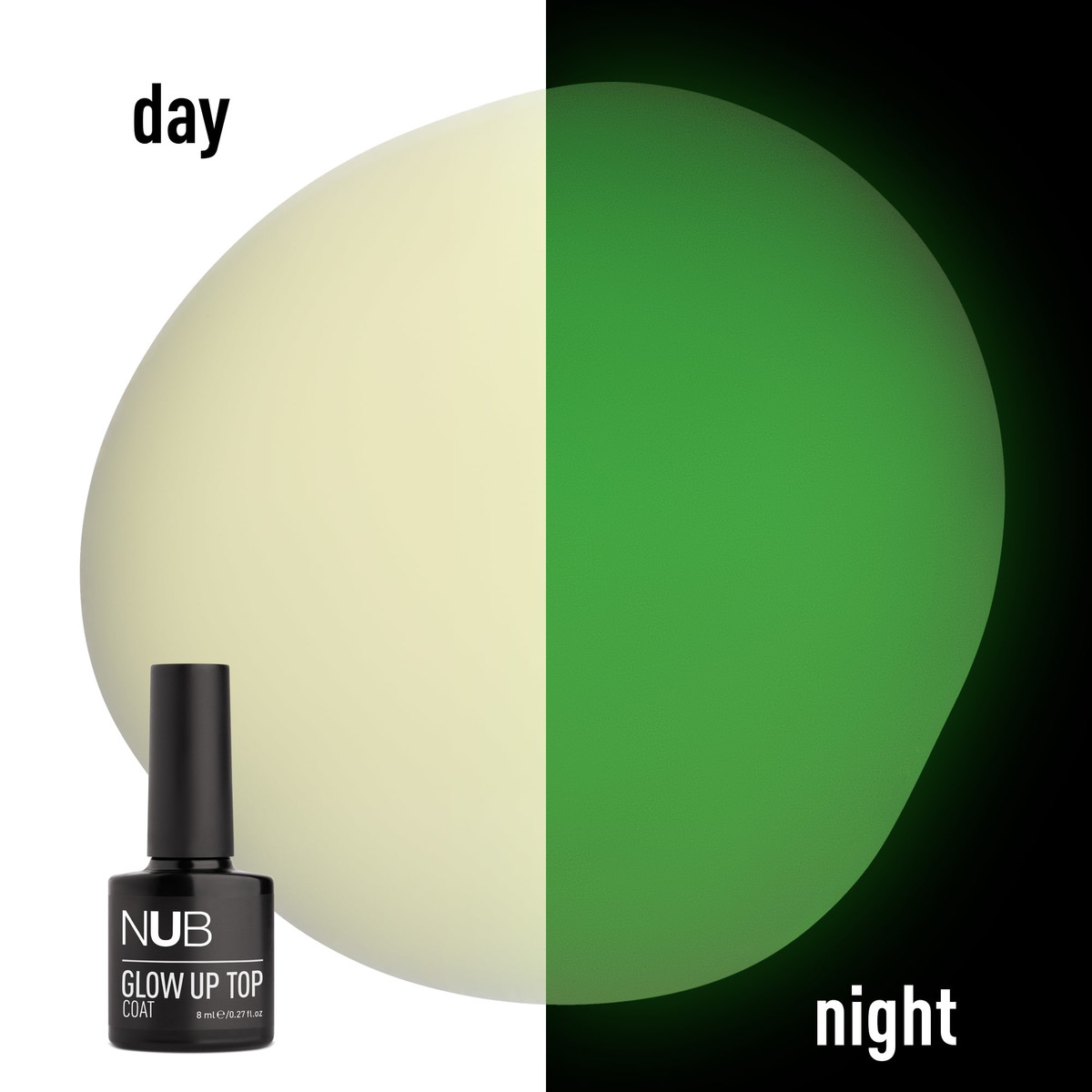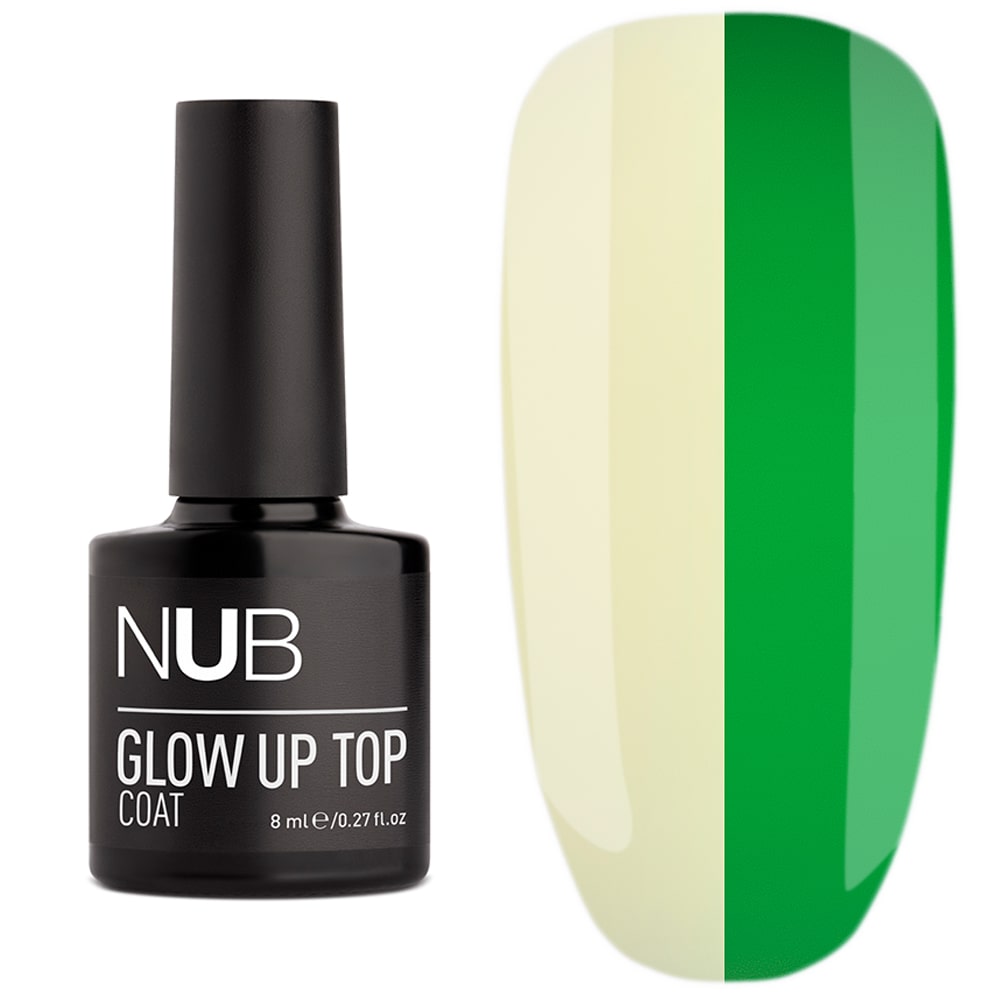 NUB Glow Up Top Coat - це спеціальний топ для гель-лакового манікюру, в складі якого є особливий пігмент люмінофор. Саме завдяки люмінофору досягається ефект світіння в темряві. Його частинки "заряджаються" від світла, а потім світяться в темному приміщенні. Люмінесцентний топ має властивість яскравого зеленого сяйва, стимулюючи фантазію майстра створювати неймовірні й фантастичні нейл-дизайни.
