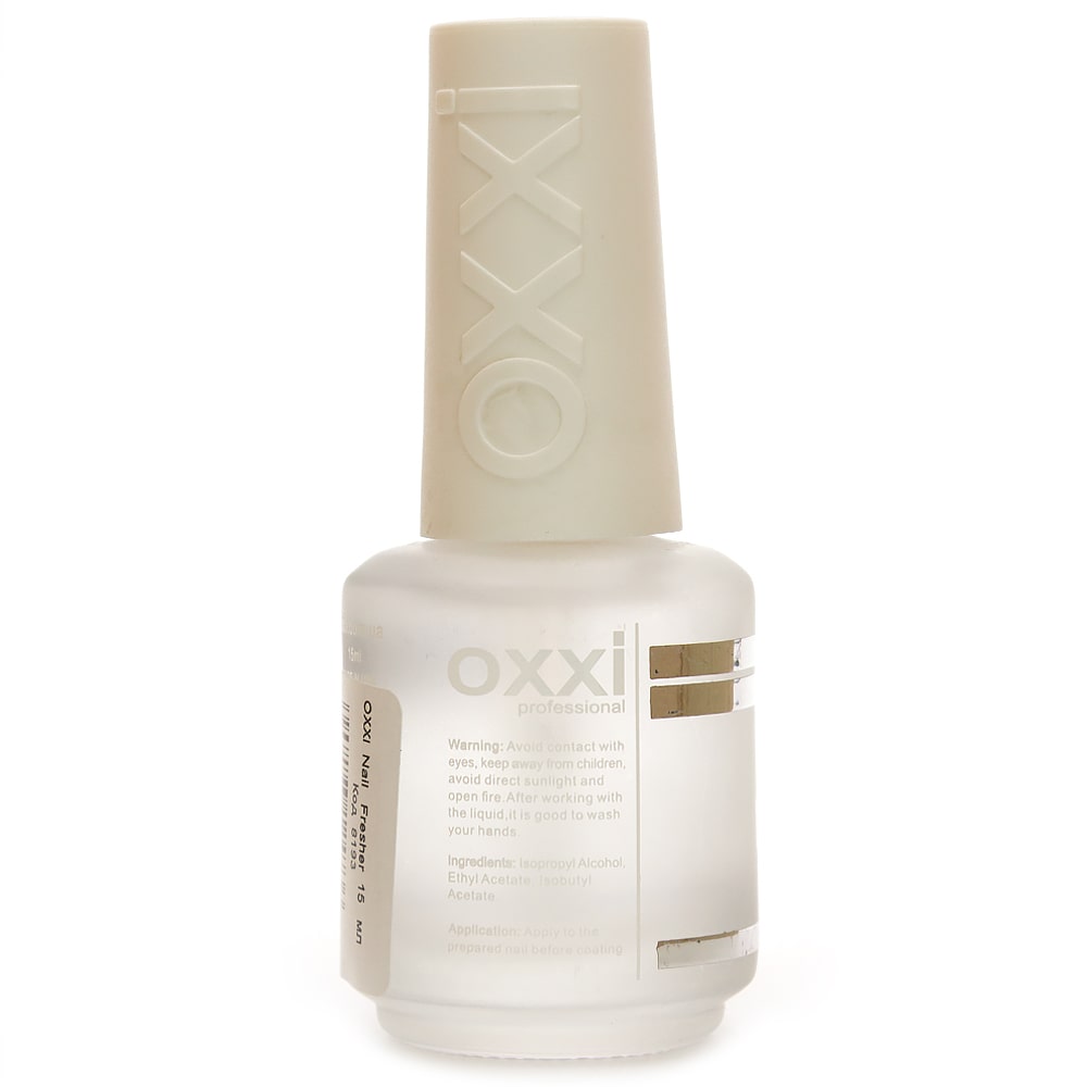 Знежирювачах для нігтів Oxxi Nail fresher, 15 мл універсальний обезжириватель, сприяє підготовці нігтьової пластини до покриття базою Oxxi, очищає її від жиру, липкості, надлишку вологи, підсушує, захищає від грибкових інфекцій, які можуть утворюватися під шарами нігтьового покриття. Позитивний результат обробки можливий завдяки щадному дії якісних безпечних компонентів, які входять до складу знежирювальних засобів. Вони делікатно розчиняють жир, бруд на нігтях, які не пересушують натуральну пластину, ароматизатори роблять процедуру проведення манікюру більш комфортною, приємною.