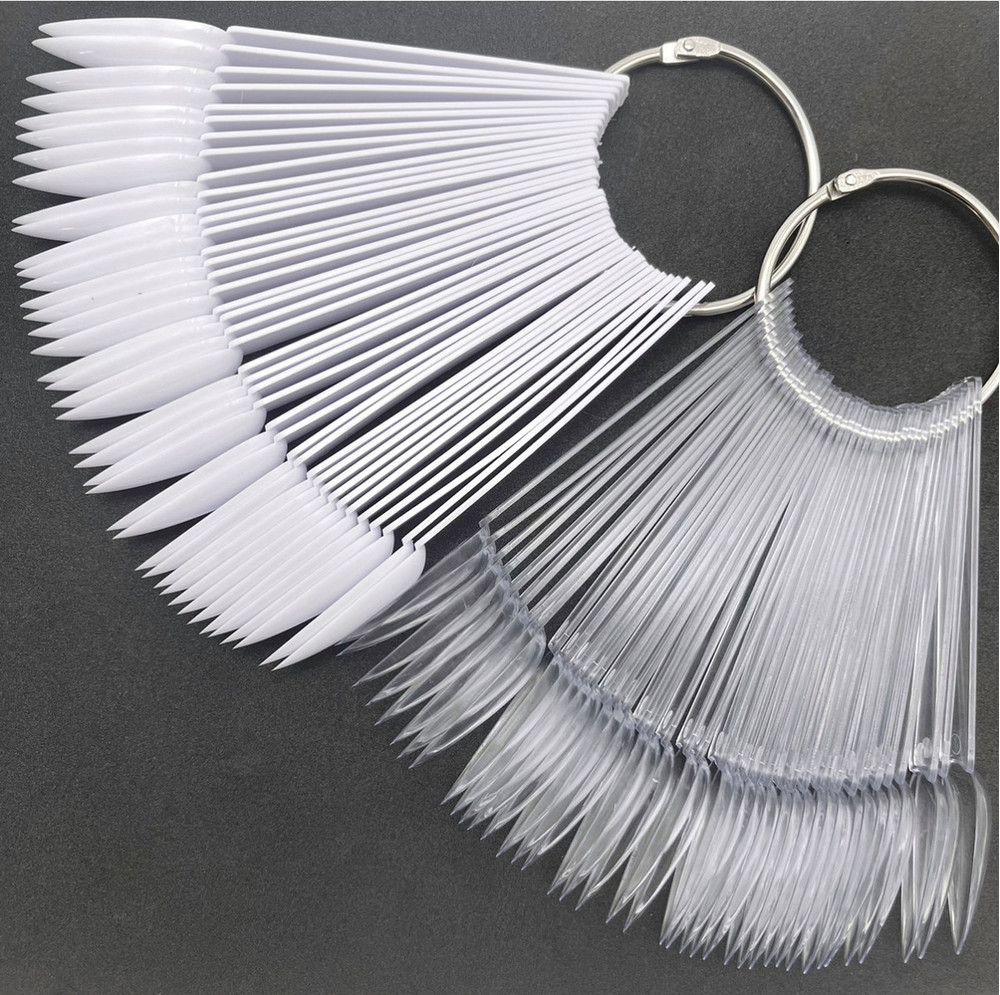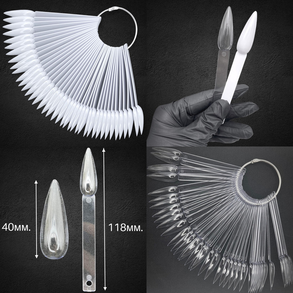 Палітра-віяло на кільці для нанесення гель лаків на 40 типів "Стилет - Мигдаль" форми білого та прозорого кольору. Для демонстрації квітів гель лаків, гелю, полігеля, акрігеля, гелевої пасти, втирок, стемпінгу та демонстрації інших зразків дизайну манікюру нігтів. довжина нігтики - 4 см.