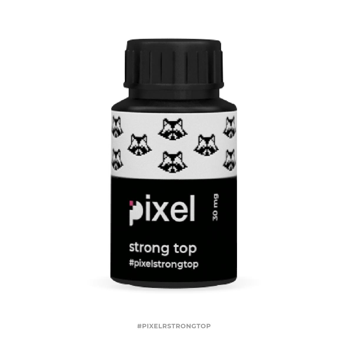 #pixelstrongtop – якісне фінішне покриття без липкого шару. Надає чудового блиску та яскравості гель-лакам і захищає від сколів, тріщин та помутніння.