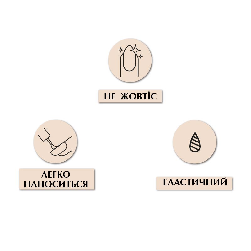 Топ не розтріскується, дуже міцний, має додатковий захист від відколів і тріщин. Гіпоалергенний, не має в складі шкідливих речовин, не володіє різким неприємним запахом, швидко висихає.