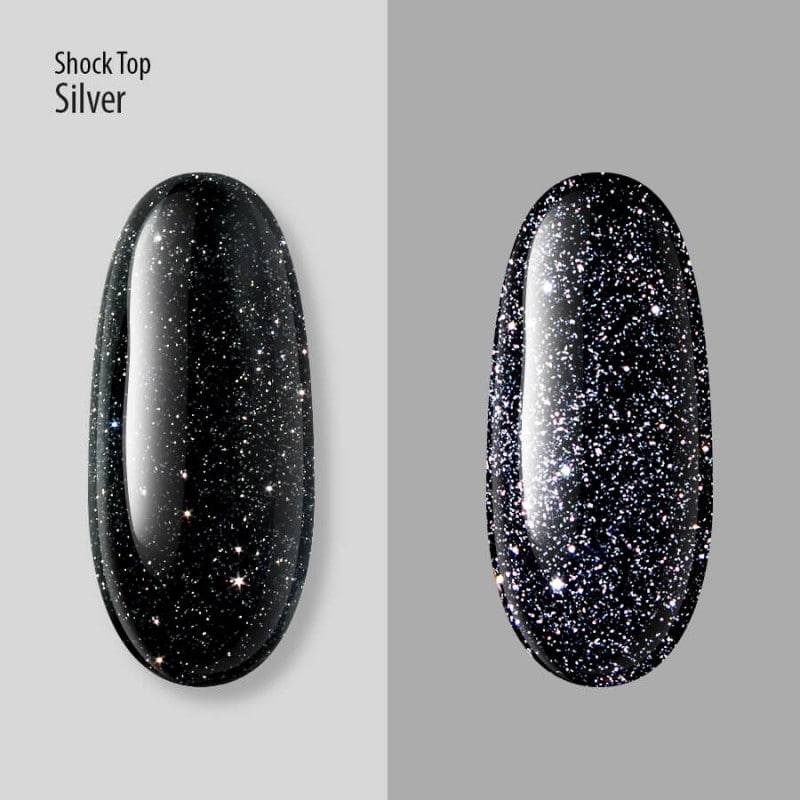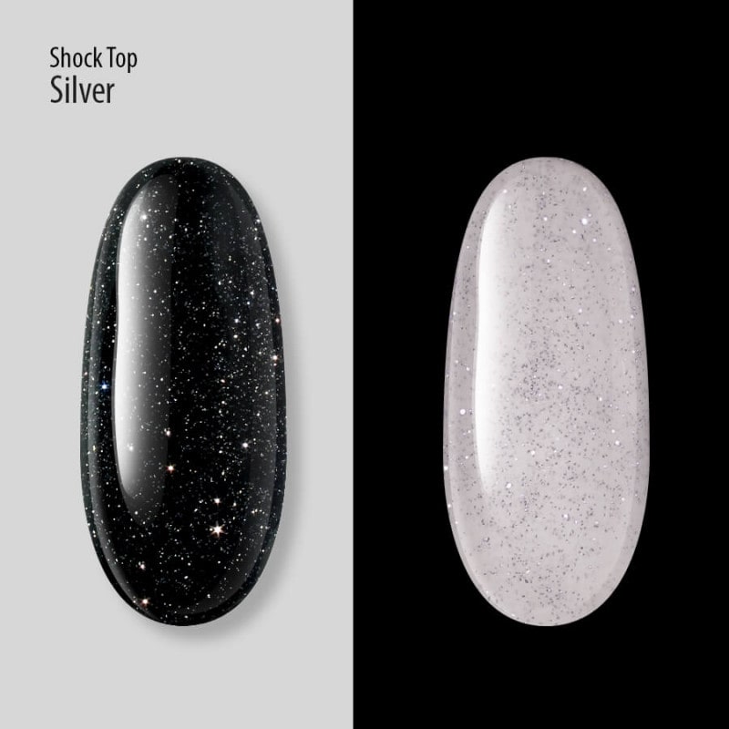 Shock Top PNB, Silver має густу консистенцію. Працювати з ним одне задоволення: самовирівнюється, блискітки лягають рівномірно. Як результат, Ви отримуєте ідеально гладку поверхню покриття, від якого неможливо відірвати погляд.