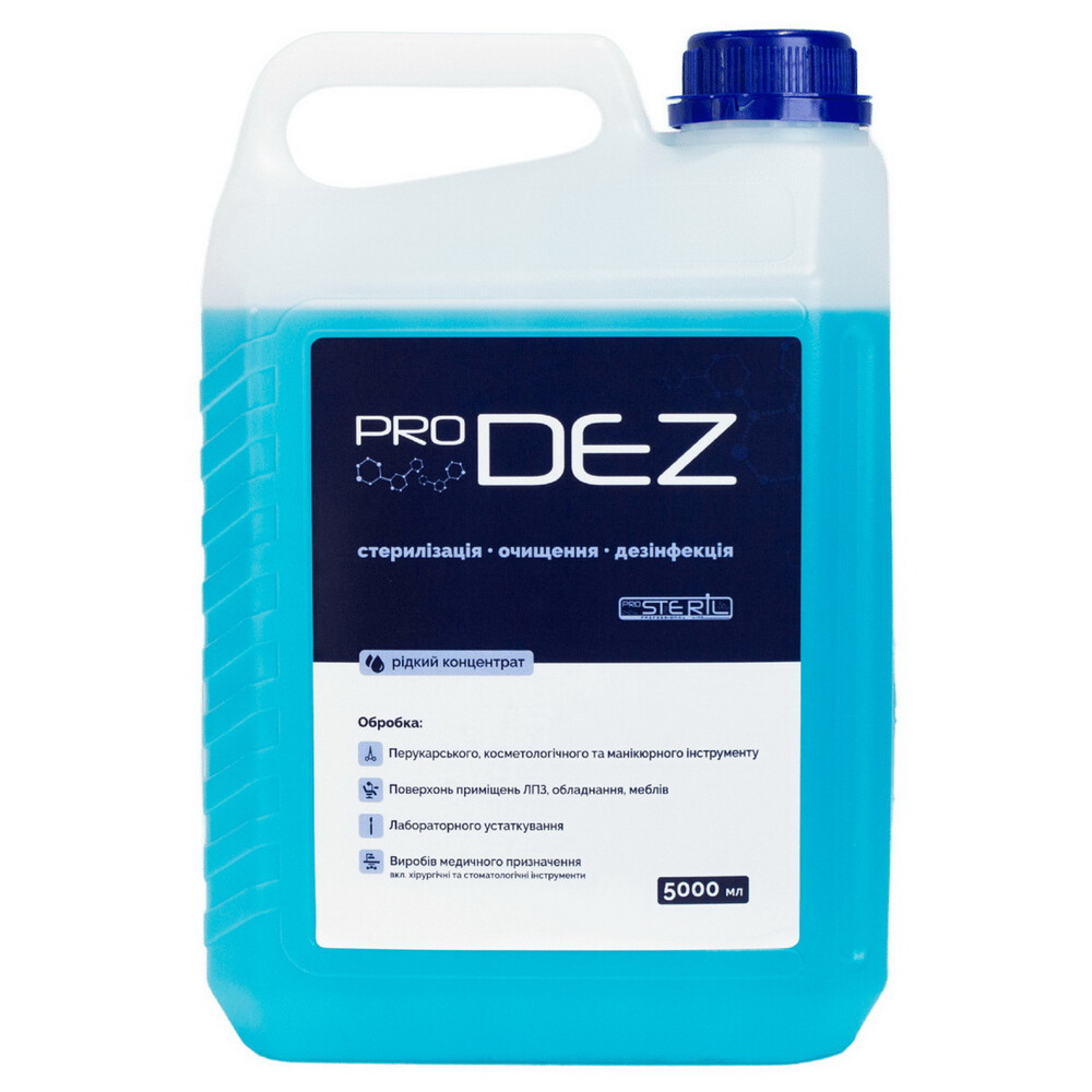 PRODEZ– це високоефективний дезінфекційний засіб (КОНЦЕНТРАТ), спеціально розроблений для медичних закладів, стоматологічних клінік, лабораторій та інших професійних сфер, де важливо забезпечити максимальну стерильність. Завдяки потужній формулі, він ефективно знищує бактерії, віруси, грибки та інші патогени, забезпечуючи тривалий захист поверхонь та інструментів.