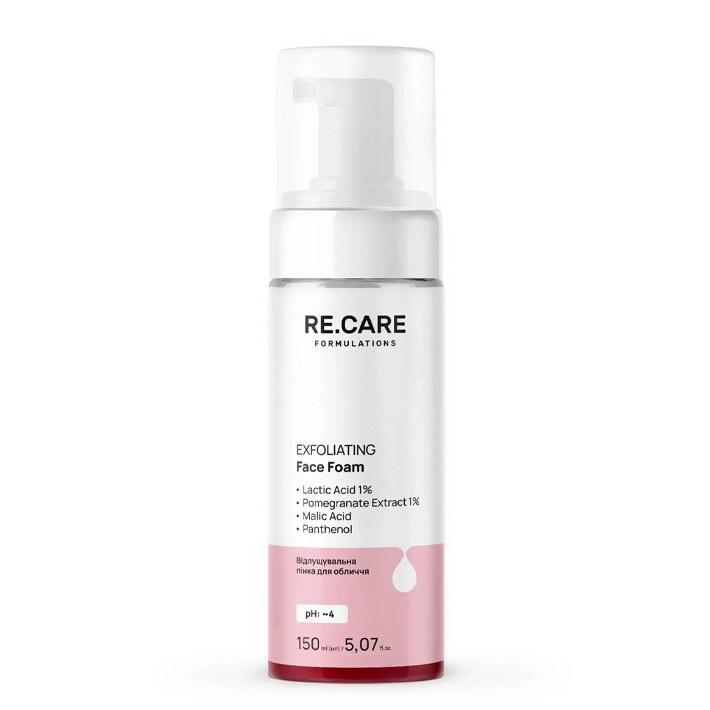 RE.CARE Exfoliating Face Foam - відлущувальна пінка для обличчя, яка забезпечує м'яке очищення, сприяє клітинному оновленню та покращує текстуру шкіри. Її дія заснована на комбінації двох кислот - молочної та яблучної. Цей симбіоз делікатно видаляє ороговілий епітелій, вирівнює тон, повертає природне сяйво. Гранатовий екстракт працює як потужний антиоксидант, тонізує епідерміс та захищає від негативних зовнішніх факторів. Завдяки пантенолу дерма отримує зволоження, він також знімає подразнення та зміцнює бар'єрні функції.