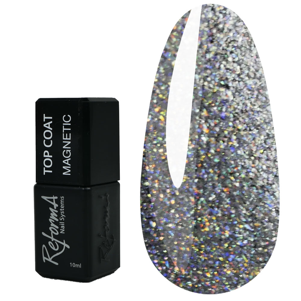 Топ ReformA Top Magnetic - це дуже якісний топ без липкого шару, який має світловідбивний ефект. Цей унікальний топ для нігтів можна використовувати на гель-лаки різних кольорів від ніжних пастельних до глибоких темних відтінків. Переваги топа тішить кожного майстра. Світловідбивний топ має середню консистенцію, легко наноситься і розподіляється по нігтьовій пластині, дозволяє уникнути сколів та подряпин. Тисячі найдрібніших сяючих частинок стануть справжньою окрасою для будь-якого гель-лаку, і зроблять образ святковим та незабутнім.