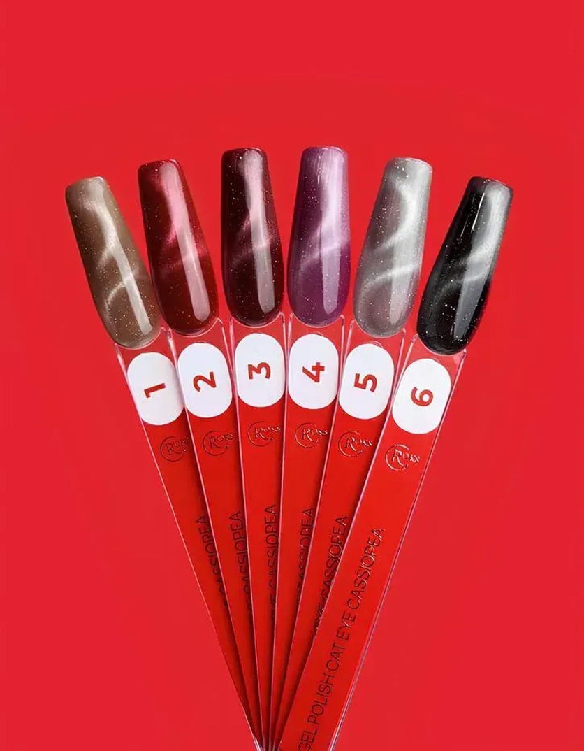 Cassiopea — відкрий світ розкішних відтінків Cat Eye Колекція гель-лаків Gel Polish Color Cassiopea Cat Eye від Roks — це 6 магнетичних відтінків, які зачаровують глибиною та розкішним сяйвом. Кожен колір ніби оживає під дією магніту, створюючи унікальні переливи та кришталеве мерехтіння, що нагадує загадкове сяйво коштовних каменів. У складі кожного відтінку — мільйони металевих частинок, які ідеально реагують на магніт і дозволяють створювати справжні витвори мистецтва на нігтях. Висока пігментація гарантує насичене покриття вже з перших мазків, економлячи час майстра і даруючи клієнтці розкішний результат. З Cassiopea ти відкриваєш для себе безмежний простір для творчості: від ніжних загадкових переливів до сміливих магнетичних візерунків, що нікого не залишать байдужим.