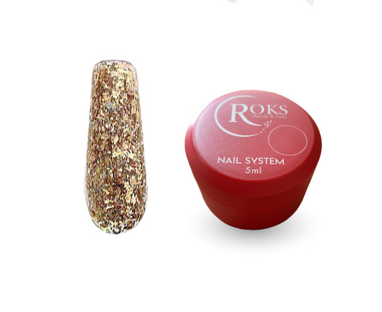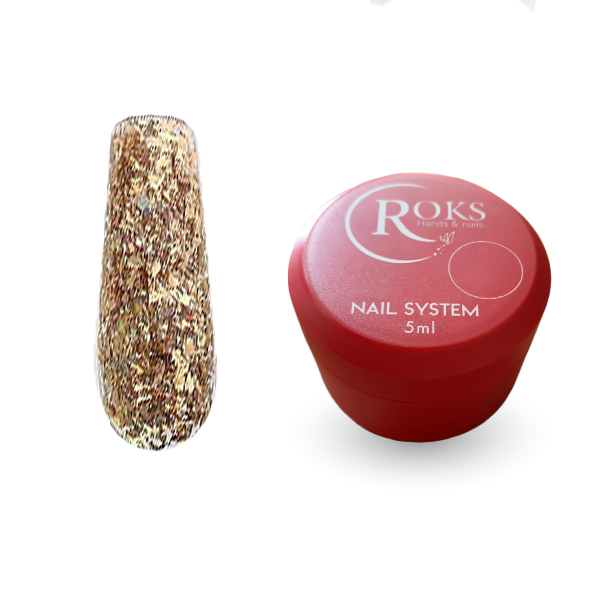 Roks Glitter Color – це гель-лак з блискітками, який надає нігтям сяючого та святкового вигляду.