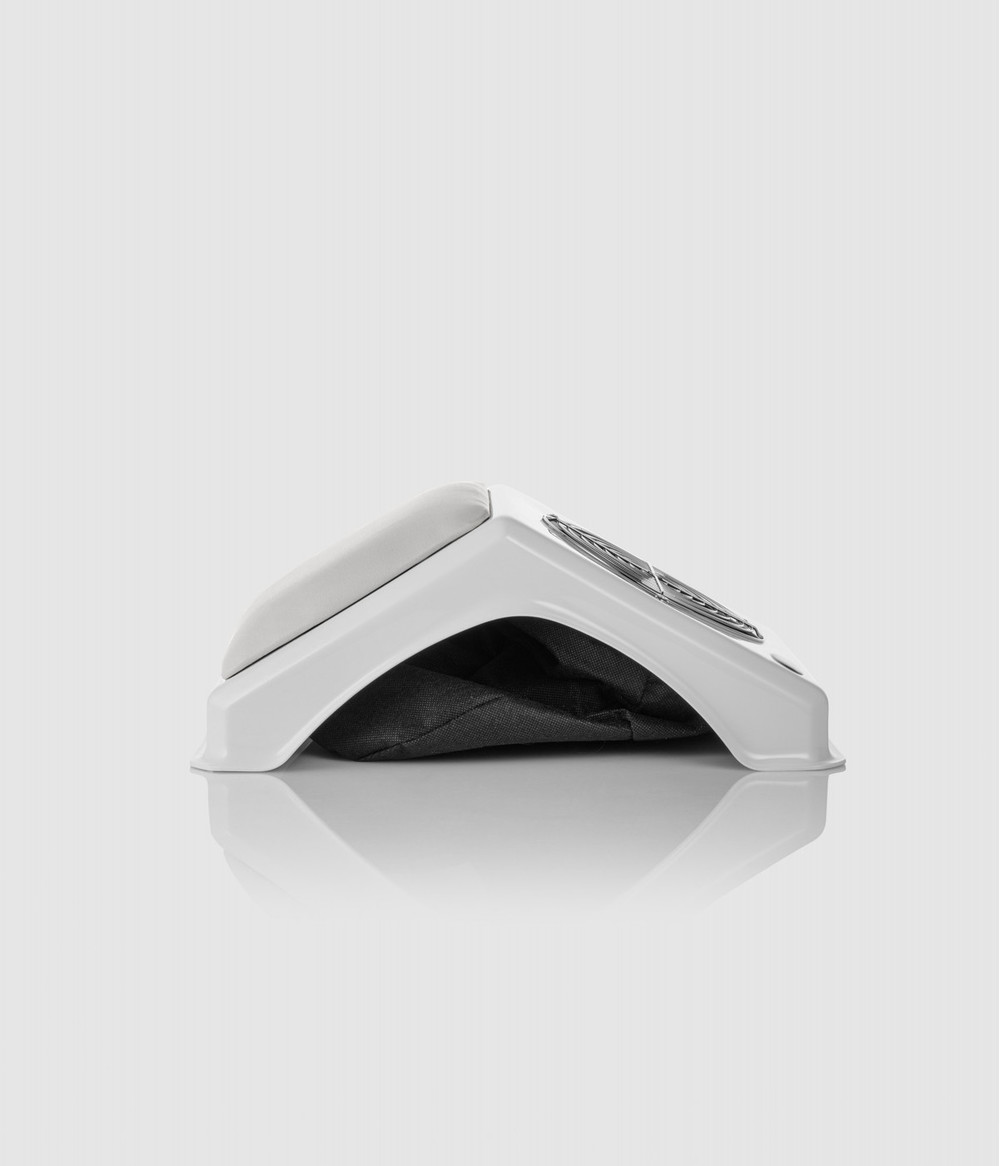 Она оборудована промышленным вентилятором, в котором используются подшипник качения, срок эксплуатации которого составляет около 50 000 часов - до 6 лет непрерывной работы. Данная модель не создает лишнего шума. Производительный мотор идеально подойдёт для мастеров, работающих даже с самым летучим материалом. При наращивании и коррекции образовывается пыль, которая негативно влияет на дыхательные пути и на здоровье в целом, данное приспособление придаст работе комфорт, безопасность и чистоту на рабочем месте.