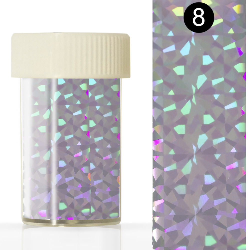 Фольга для литья в баночке KODI PROFESSIONAL № 8 – это металлизированное напыление мелкодисперсных частиц, нанесенных на длинную ленту 4*110 см лазерным способом. Дизайн размещен в специальной баночке для удобства в работе мастер ногтевого сервиса и последующего хранения. Эффектный дизайн фольгированного покрытия в виде осколков стекла разного формата создает на ногтях четкие блики геометрической формы. За счет такого дизайна можно сделать акцент на одном пальце руки или фрагментарно обыграть творческую задумку.