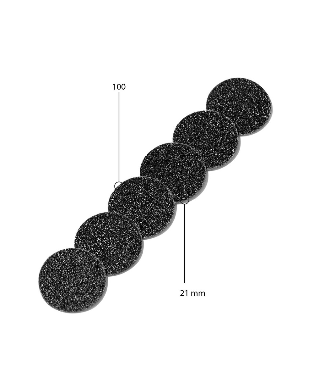 Одноразовые файлы абразивностью 100 грит и диаметром 21 мм идеально подходят для обработки стоп с гиперкератозом и натоптышами. Высококачественный материал обладает водоотталкивающими свойствами, за счет чего можно работать как по сухой, так и по влажной коже, на которой предварительно были нанесены смягчающие подологические средства. На внешней стороне файла есть крепкая клеевая основа для надежной фиксации абразива на поверхности диска. Без МП.