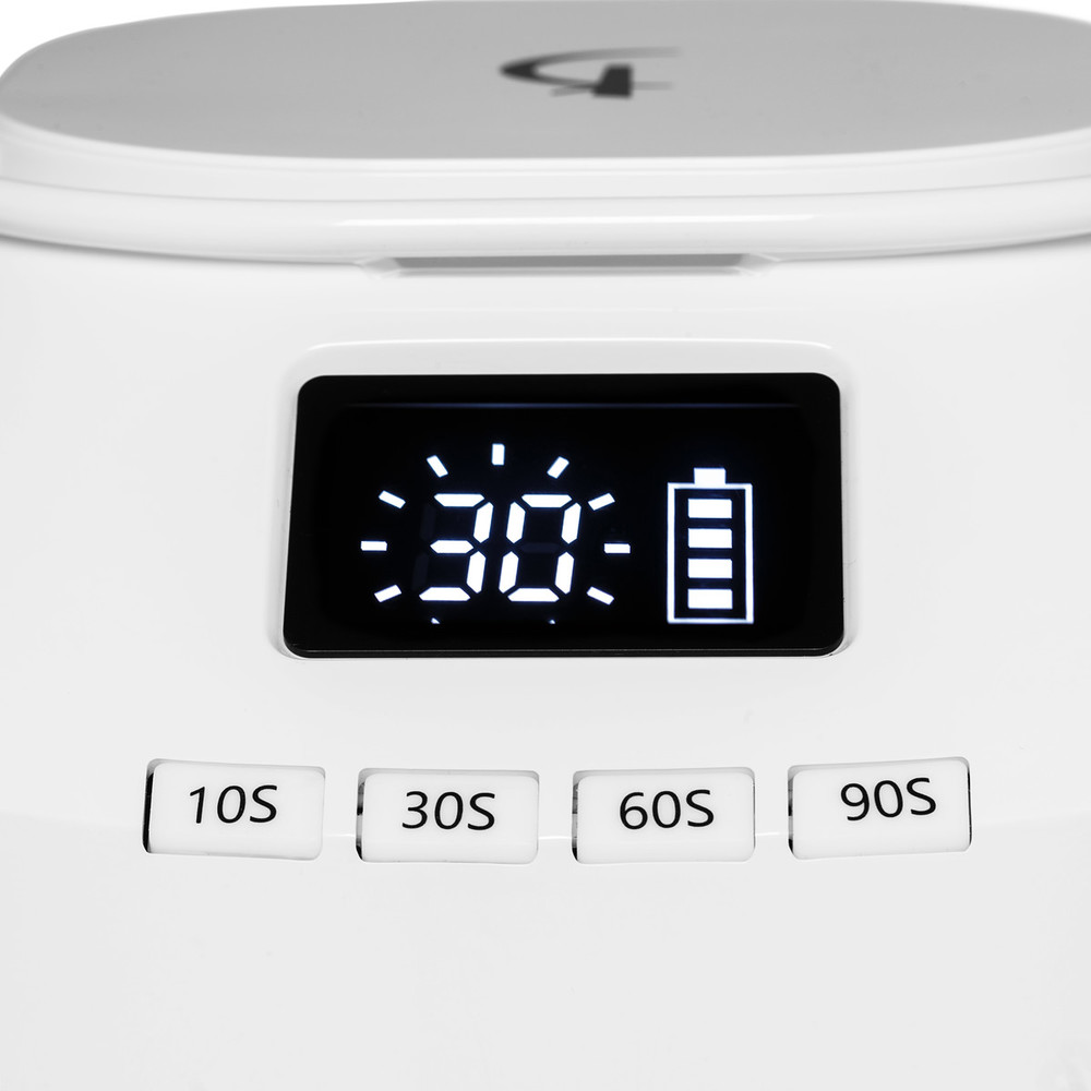 Таймер на 10, 30, 60 и 90 секунд позволяет выбрать оптимальный режим для каждого процесса, а на HD-LCD дисплее можно осуществлять контроль по времени. Лампа имеет небольшой, компактный размер и минимальный вес. Ее ацетоностойкий корпус легко очищается от частиц пыли и остатков нейл-материалов, при этом лампа сохранит свою внешнюю привлекательность. На верхней части корпуса предусмотрена ручка для комфортной транспортировки, а нижний корпус снимается, что позволяет использовать лампу также для педикюра.