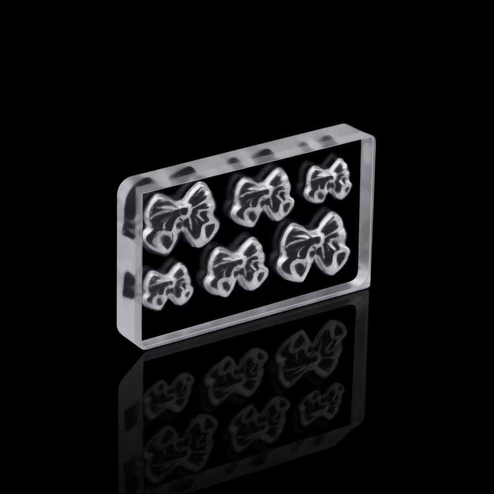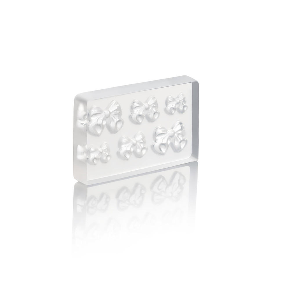Молд изготовлен из прозрачного силикона, внутри которого выбиты формы рисунка. Модель 01 – объемные бантики разного размера. Просто заполните форму любым цветным гелем, полимеризуйте – и 3D-наклейка своими руками готова. Рисунки получатся полностью идентичными и при этом детализированными, а процесс декора займет всего пару минут времени.