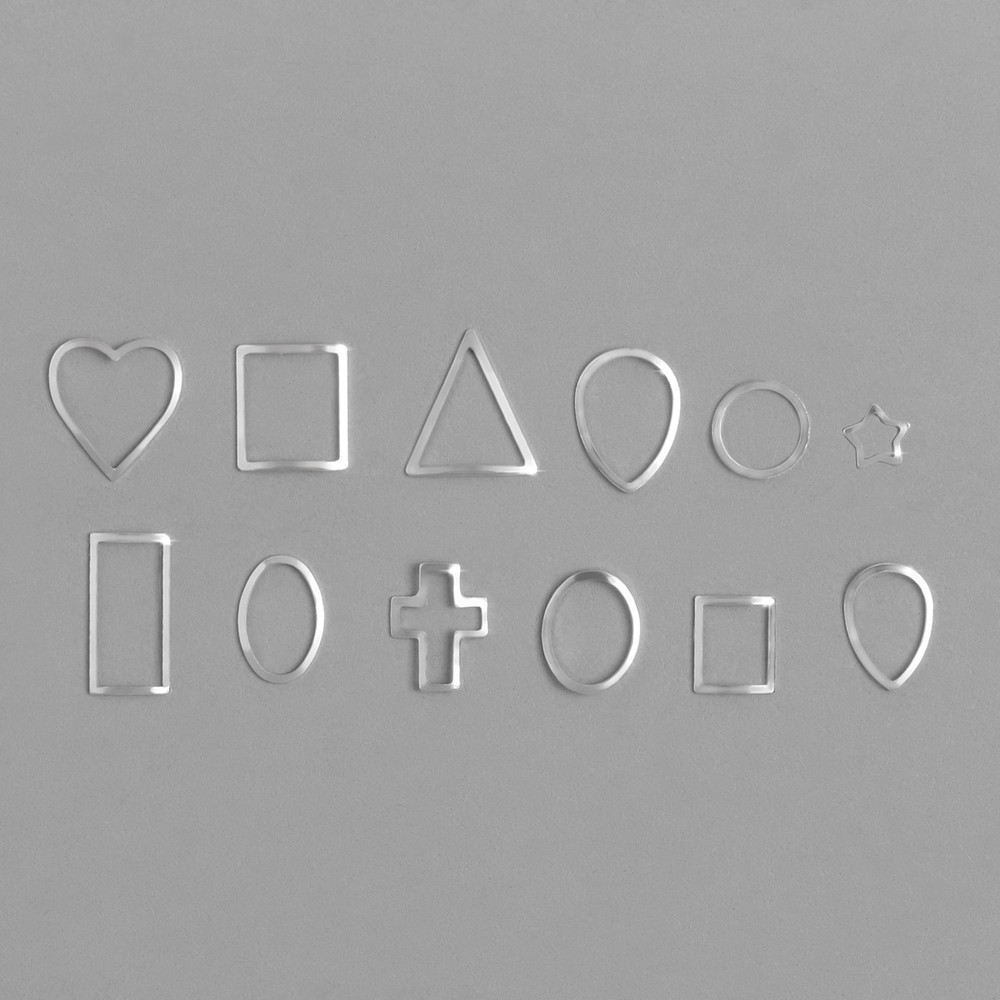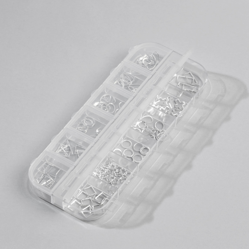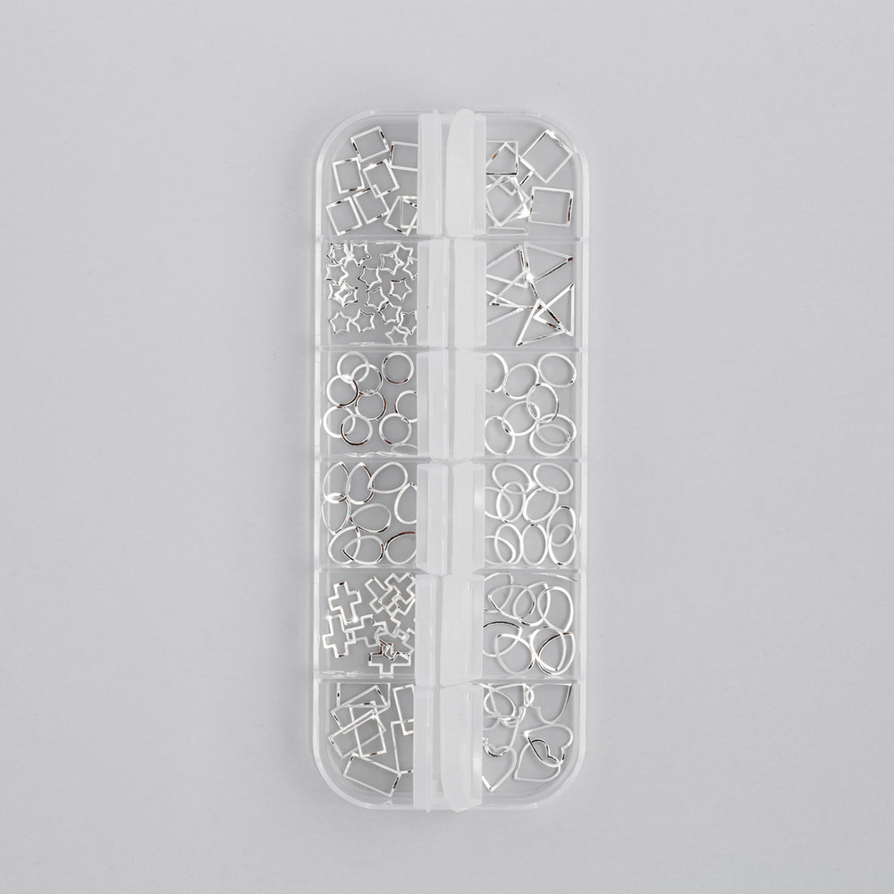 Набор №10 включает прочную, прозрачную пластиковую коробку на 12 отделов, в каждом из которых тематический металлизированный декор серебряного цвета. Все элементы представляют собой тонкие, эластичные и гибкие металлические рамки геометрических форм: овалы, круги, квадраты, прямоугольники, сердца и крестики – далеко не полный перечень всего того, что вы найдете в наборе. Такие элементы станут прекрасной альтернативой литью, создавая особую глубину и объем композиции. С креплением подобного декора легко справится даже новичок, который следует рекомендациям от технологов.