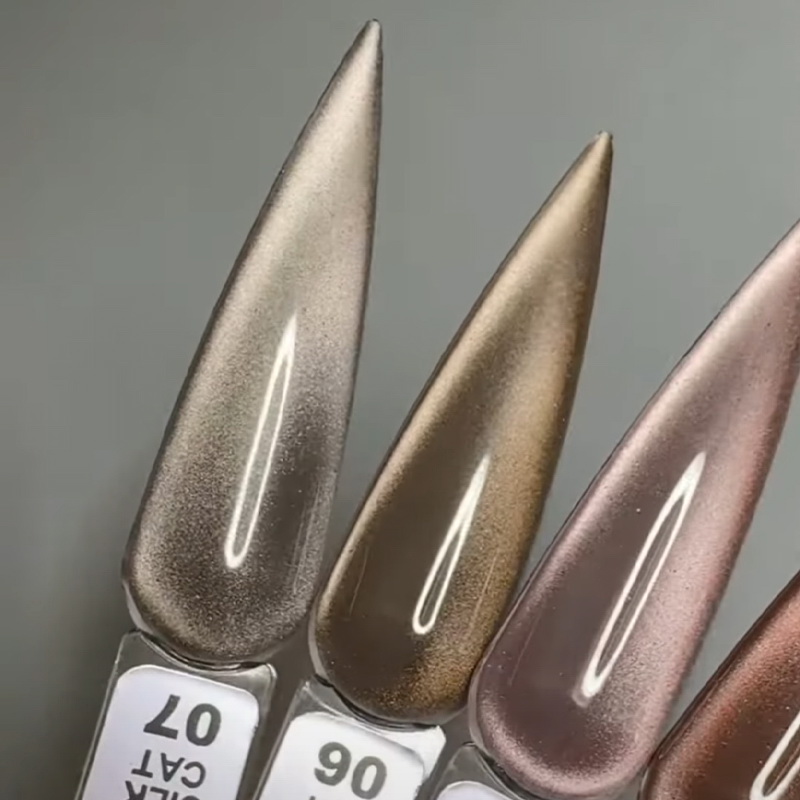Гель-лак Luxton Silk Cat - оригинальное покрытие с мерцающими, объемными переливами микрочастиц, которые формируют причудливые глубокие рисунки на ногтях, создают эффектный дизайн, придают маникюру черт загадочности. Красивую блестящую полоску, имитирующую кошачий глаз, можно сделать с помощью специального магнита.