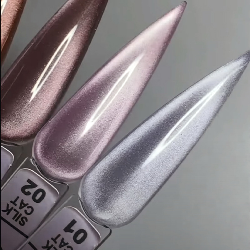 Гель-лак Luxton Silk Cat - оригинальное покрытие с мерцающими, объемными переливами микрочастиц, которые формируют причудливые глубокие рисунки на ногтях, создают эффектный дизайн, придают маникюру черт загадочности. Красивую блестящую полоску, имитирующую кошачий глаз, можно сделать с помощью специального магнита.