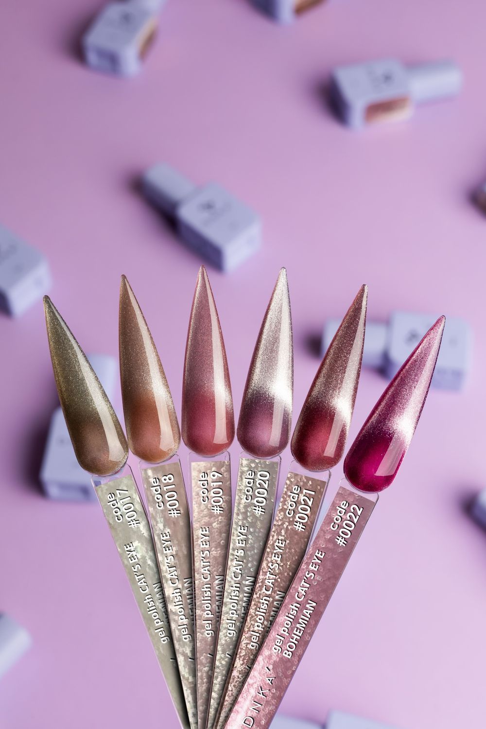 DNKa’ Cat's Eye — одна из коллекций гель-лаков с эффектом кошачьего глаза. Нежный, кристаллический эффект достигается благодаря блестящим микрочастицам, а коллекция представлена тремя оттенками: изящным бежевым, пудро-розовым и ярким малиновым, идеально подходящим для летнего сезона. Гель-лаки можно наносить в один слой для легкого камуфлирующего эффекта с сохранением полупрозрачности (максимум два слоя для полного покрытия). Они отлично покрывают ногти и не требуют черной подкладки. Также могут служить основой для разных дизайнов.