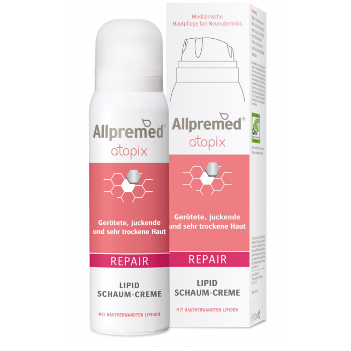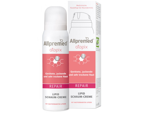 Липидная крем-пенка Allpremed atopix REPAIR была разработана для ежедневного ухода за красной, зудящей и очень сухой кожей, а также для ежедневного ухода за нейродермитом. Зуд заметно уменьшается, поврежденный кожный барьер восстанавливается, стимулируется собственная регенерация кожи. Поскольку в нем не используются ароматизаторы, красители или консерванты, он особенно хорошо переносится. Также подходит для чувствительной детской кожи. Крем-липидная пена на основе запатентованной технологии восстановления кожи BarrioExpert LIPO 2 содержит связанные с кожей липиды, которые, как было доказано, подходят для нарушенного кожного барьера атопической кожи и, таким образом, способствуют вышеупомянутому восстановлению кожного барьера.
