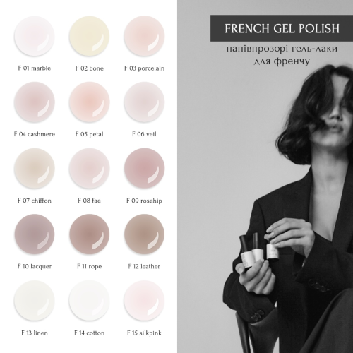 FRENCH GEL POLISH - высококачественный полупрозрачный гель-лак средней густоты с улучшенной SOFT FORMULA. Подходит как для классического французского маникюра, так и в качестве самостоятельного полупрозрачного чудного оттенка. Гель-лак обладает повышенной вязкостью, не затекает в пазухи, не имеет резкого запаха. Обладает оптимальной скоростью полимеризации в UV/LED лампах.