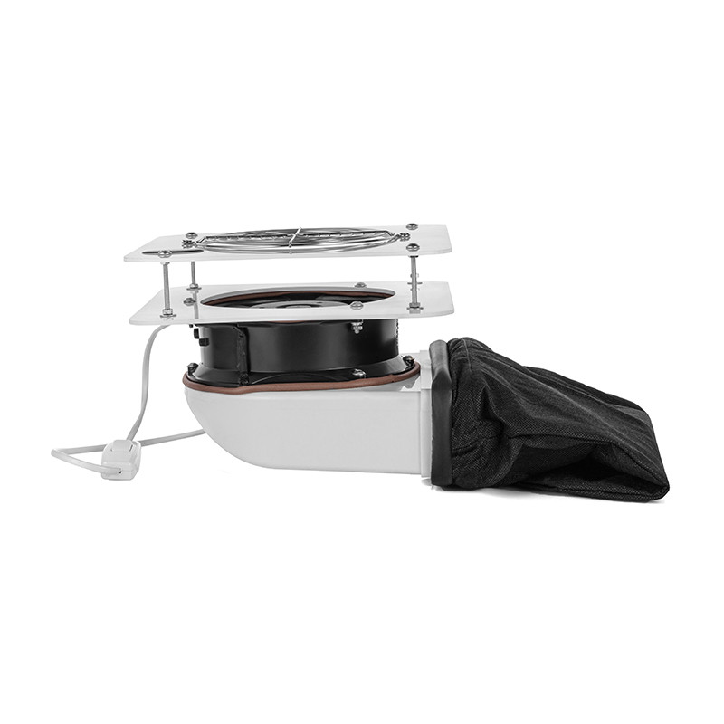 Часть, которая крепится под столом, изготовлена ​​из прочного пластика, имеет удобное расположение крепления для сменного мешочка и кнопку для включения. На поверхности стола крепится только пластина с металлической защитной решеткой.