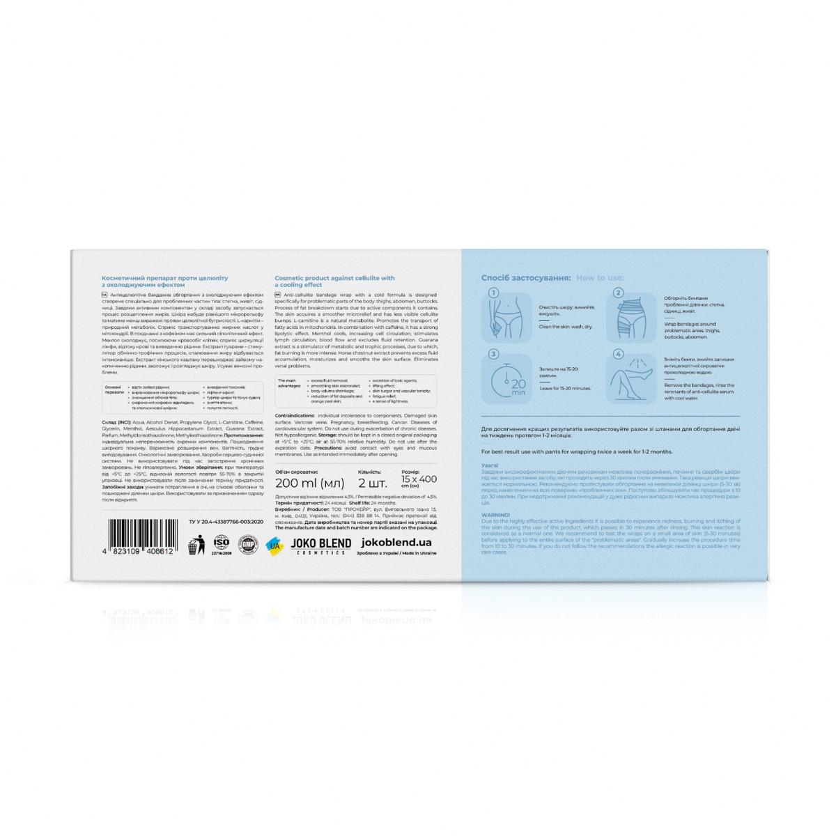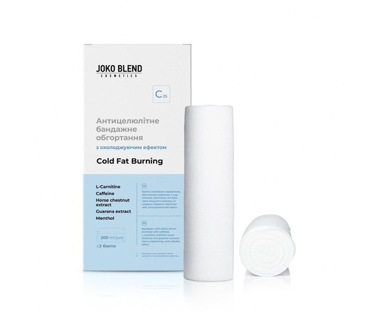 Антицеллюлитное бандажное обертывание с охлаждающим эффектом Joko Blend™ - эффективное средство для похудения и устранения целлюлитных отложений, борьбы с растяжками и предупреждения их появления, уменьшения дряблости кожи. Обертывание запускает процессы расщепления жиров и приводит кожу в тонус, интенсивно увлажняет и питает ее полезными веществами. Охлаждающий эффект помогает улучшить обмен веществ в подкожно-жировой клетчатке и выровнять тон и рельеф кожи. Состав обертывания обогащен активными натуральными компонентами, которые позволят быстро снизить объемы в «проблемных зонах», подтянуть и тонизировать кожу. L-карнитин - естественный метаболик. Способствует транспортировке жирных кислот в митохондрии и повышению выработки коллагена и эластина, благодаря чему кожа приобретает здоровый и подтянутый вид. В сочетании с кофеином обладает сильным липолитическим эффектом. Ментол охлаждает, усиливая кровообращение клеток. Способствует циркуляции лимфы, оттоку крови и выведению жидкости. Экстракт гуараны – стимулятор обменно-трофических процессов, позволяющий более интенсивно сжигать жир. Экстракт конского каштана препятствует излишнему накоплению жидкости, увлажняет и разглаживает кожу. Устраняет венозные проблемы.