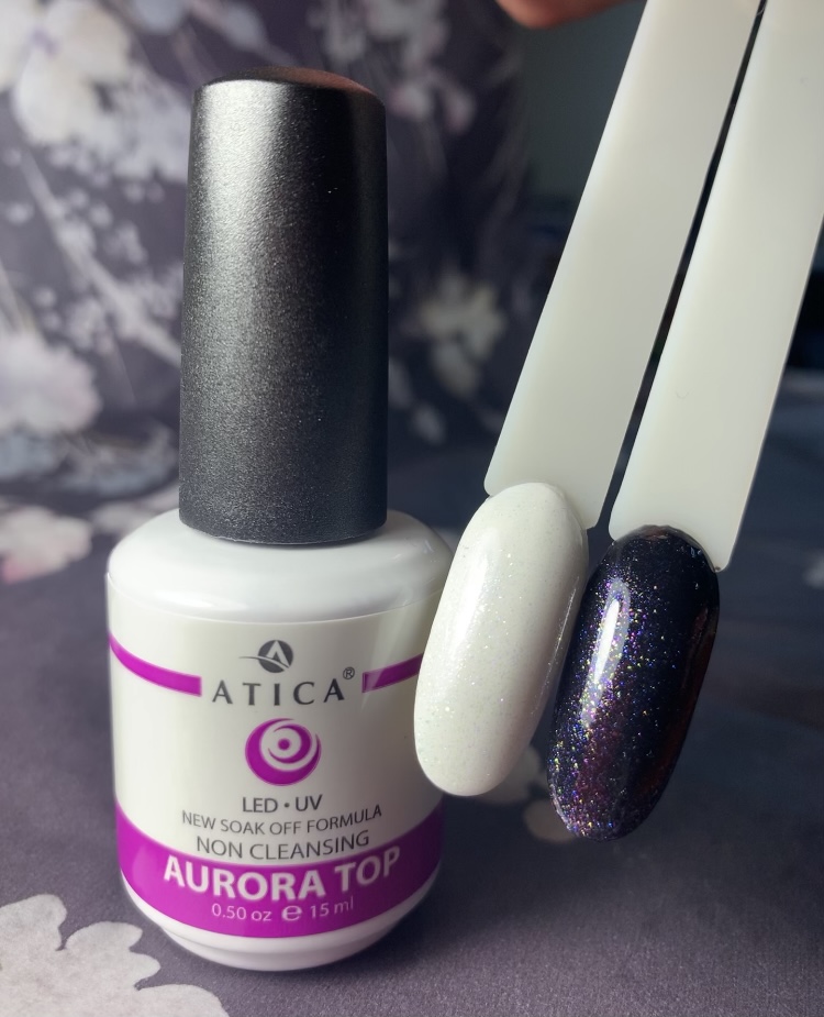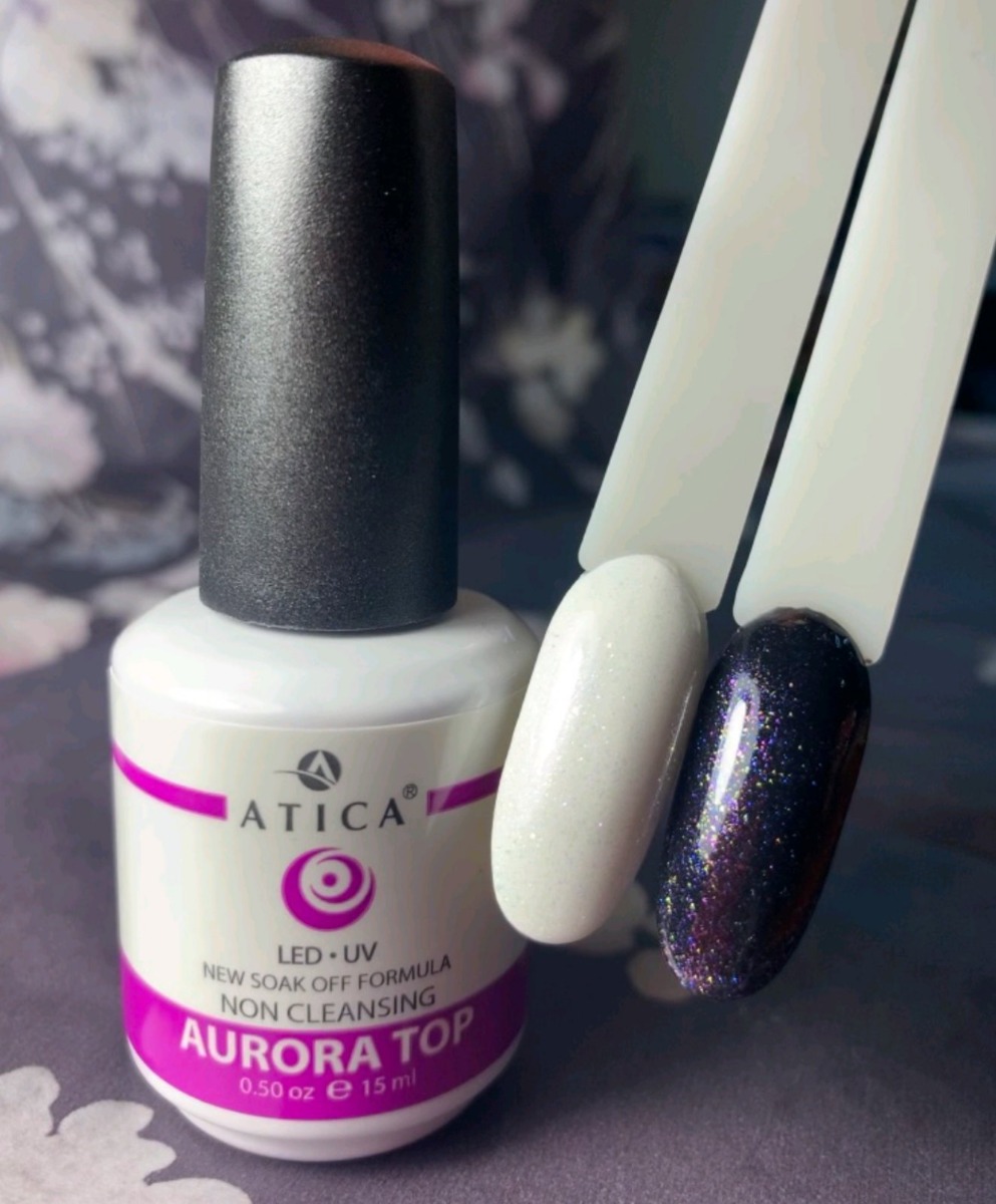 Добавить сияние любому маникюру очень легко с помощью такого средства как голографический топ Atica. Кроме того, он укрепляет покрытие и защищает его от повреждения, в его составе присутствуют яркие частицы разных цветов. Нанося его сверху на однотонное покрытие любого цвета можно создать особый дизайн.