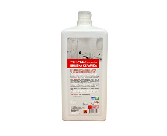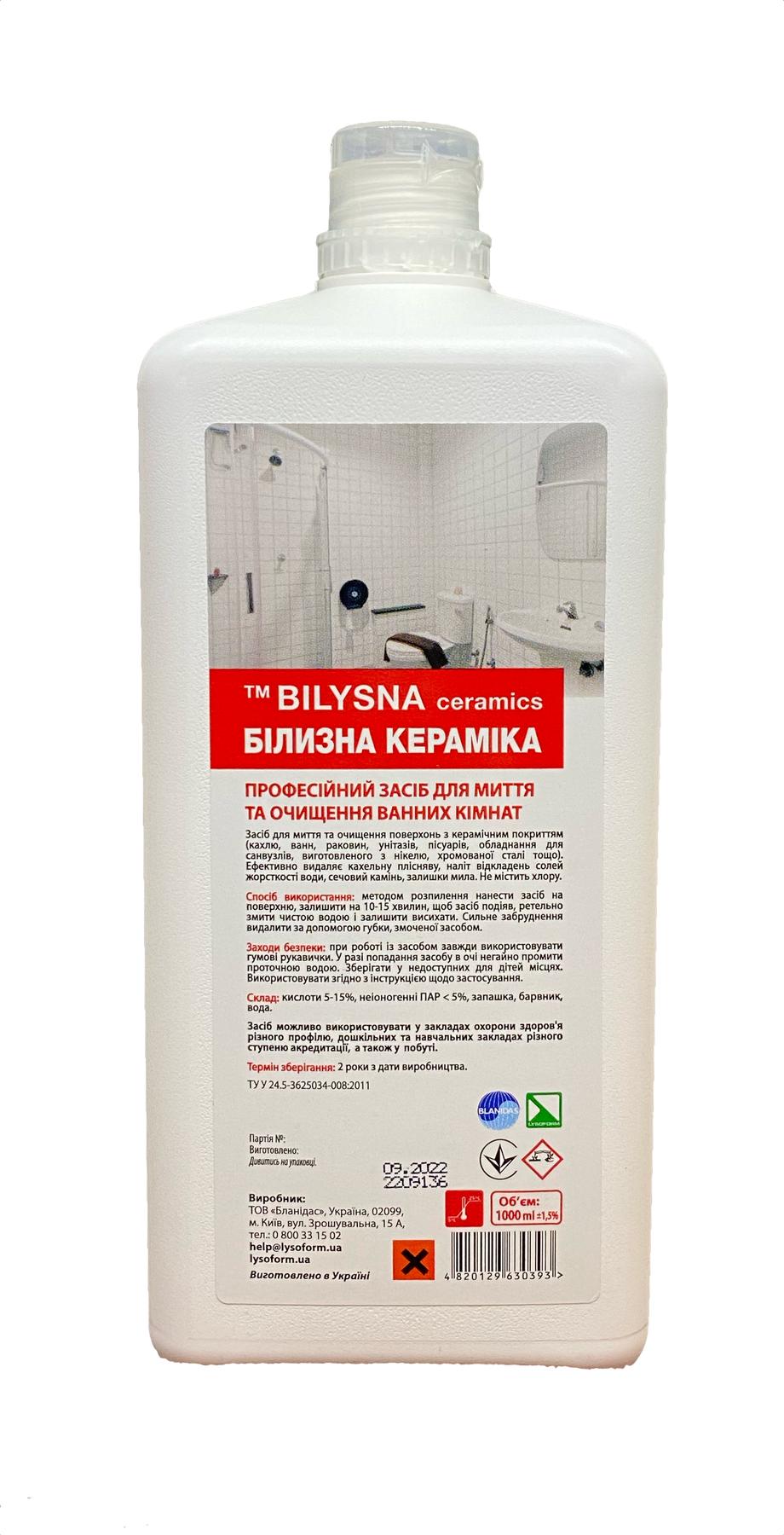 Белизна керамика (Bilysna ceramics) — профессиональное концентрированное средство для мытья и очистки ванных на основе лимонной кислоты. Предназначено для использования в лечебных учреждениях всех профелей. Помогает эффективно очистить керамические поверхности (ванны, кафель, унитазы, раковины, оборудование для санузлов, сделанное из никеля, хромированная сталь и т.д.). Качественно удаляет известковый налет, кафельную плесень, остатки мыла и мочевой камень. Является безопасным средством, так как не содержит хлор.