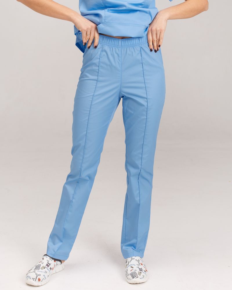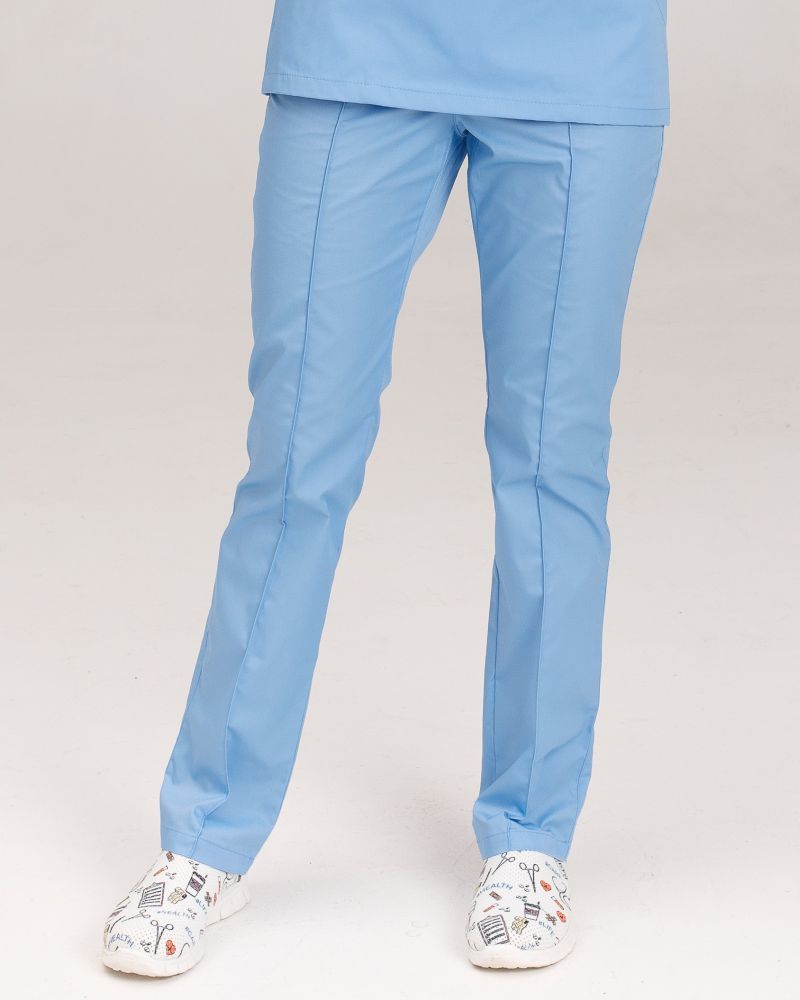 Брюки медицинские женские имеют прямой фасон. На лицевой стороне изделия расположены декоративные строчки-стрелки, которые добавляют рабочему образу сдержанности.