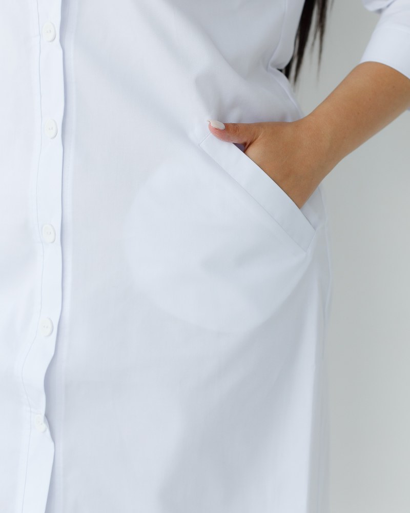 Женский халат Валери +SIZE имеет прямой фасон, рукава ¾ не ограничивают движений. Халат женский для медиков Валери +SIZE застегивается на ряд пуговиц, глубину декольте и высоту разреза вы сможете регулировать самостоятельно. На лицевой стороне халата женского медицинского Валери +SIZE расположилось два вместительный кармана, на груди декоративные карманы-обманки, дополненные брендированными пуговицами. Воротник стойка и полуприталенный фасон зрительно вытягивают силуэт, делая его более изящным, с акцентированной линией талии.