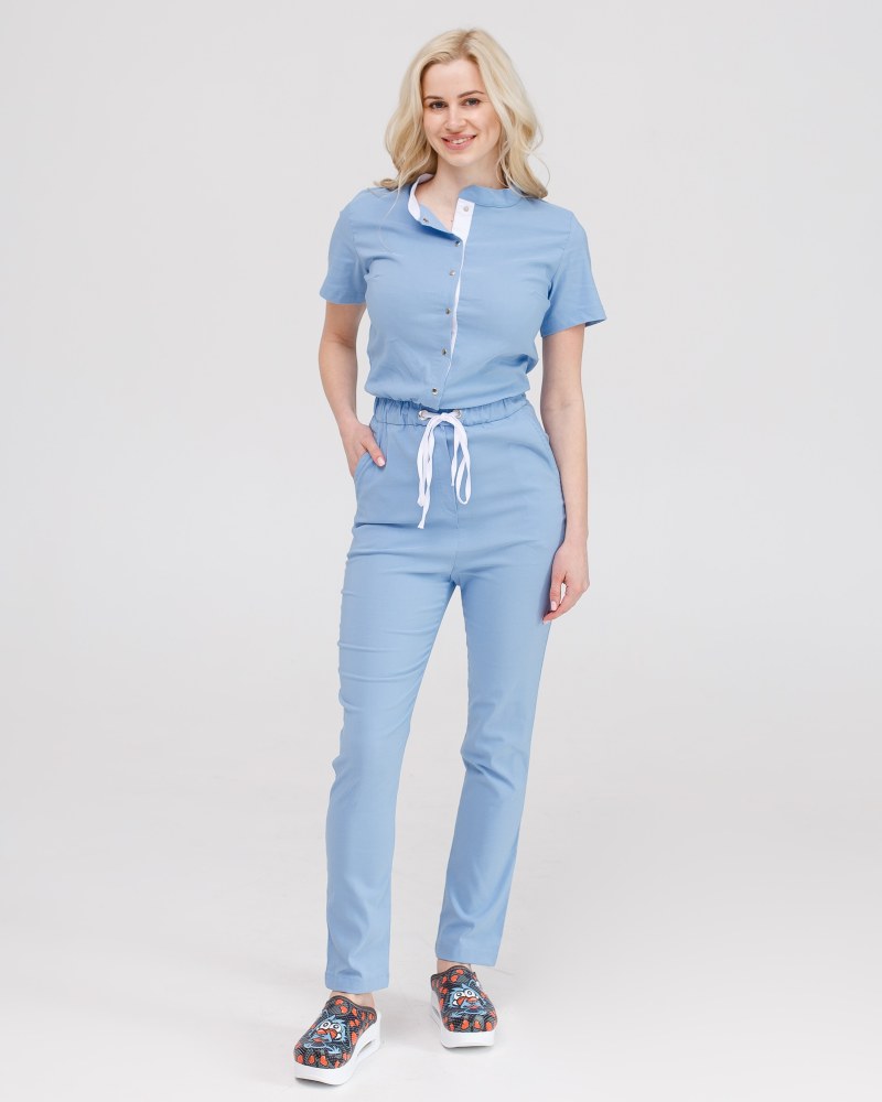 Верх и низ комбинезонов медицинский соединяются между собой пришивным поясом с кулиской и люверсами, внутри которого расположилась эластичная тесьма.