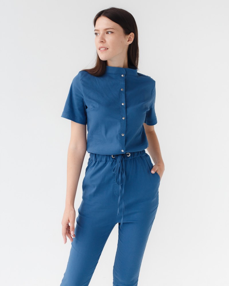 Верх и низ комбинезонов медицинский соединяются между собой пришивным поясом с кулиской и люверсами, внутри которого расположилась эластичная тесьма.