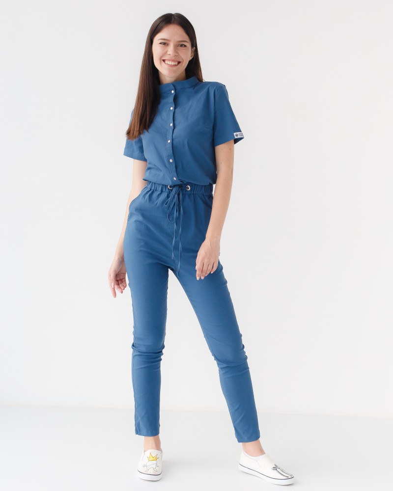 Верх и низ комбинезонов медицинский соединяются между собой пришивным поясом с кулиской и люверсами, внутри которого расположилась эластичная тесьма.