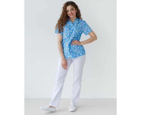 Женский костюм “Топаз” декорированный принтом состоит из рубашки медицинской с короткими втачными рукавами, вместительным карманом-кенгуру и медицинских брюк с вшитыми карманами.