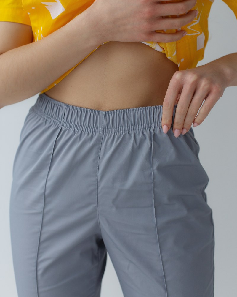Классический полуприталенный фасон, удобный V-вырез горловины и пояс медицинских штанов на эластичной резинке делают такую униформу оптимальной одеждой для длительных рабочих будней. Лицевая сторона рубашки дополнена кокеткой и вертикальными рельефами, на брюках есть декоративная строчка.