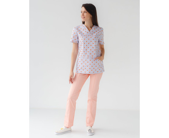 Женский костюм “Топаз” декорированный принтом состоит из рубашки медицинской с короткими втачными рукавами, вместительным карманом-кенгуру и медицинских брюк с вшитыми карманами.
