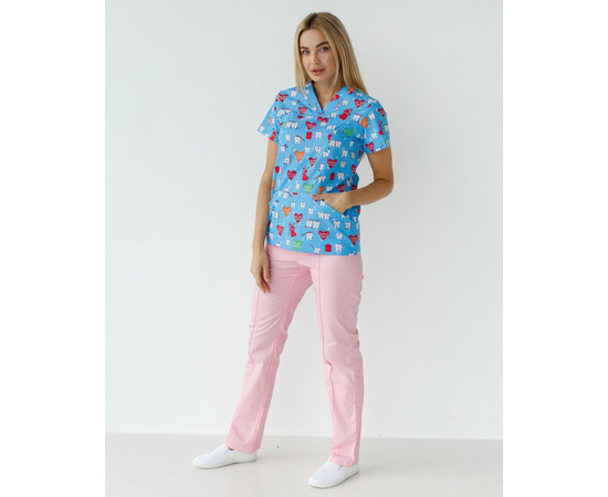 Женский костюм “Топаз” декорированный принтом состоит из рубашки медицинской с короткими втачными рукавами, вместительным карманом-кенгуру и медицинских брюк с вшитыми карманами.