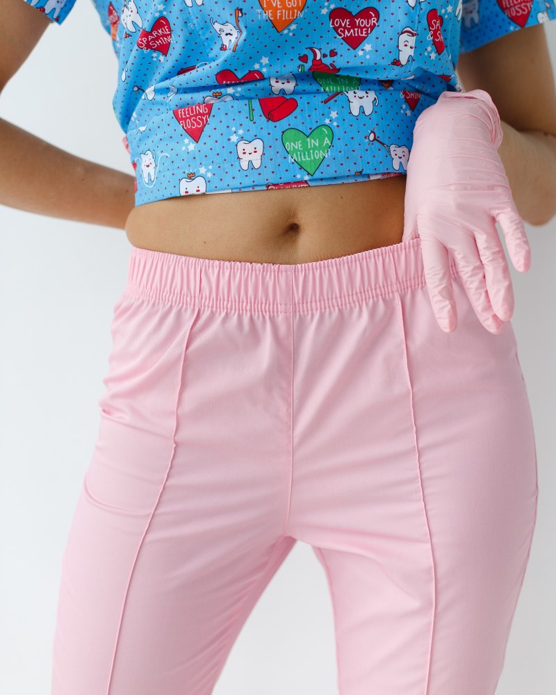 Женский костюм “Топаз” декорированный принтом состоит из рубашки медицинской с короткими втачными рукавами, вместительным карманом-кенгуру и медицинских брюк с вшитыми карманами.
