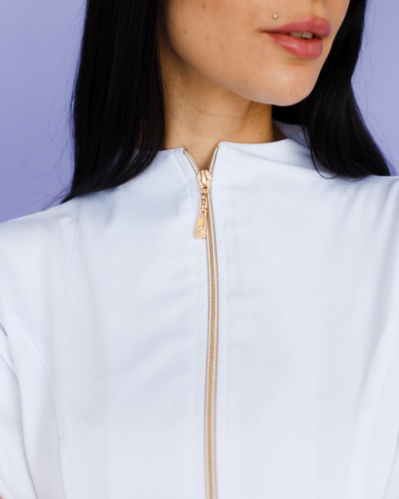 Костюм женский медицинский «Мишель» состоит из медицинской рубашки и брюк прямого фасона. Рубашка с рукавами 3/4 имеет оригинальный дизайн: широкая баска подчёркивает пропорциональность фигуры, а молния золотого цвета выступает контрастным акцентом. Есть два вместительных кармана. Низ — брюки прямого фасона на резинке. В комплекте есть пояс-завязка, чтобы ещё больше подчеркнуть талию.
