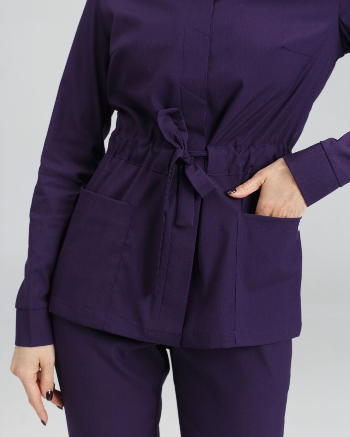 Медицинский костюм женский «Монтана» состоит из медицинской рубашки на кнопках и брюк. Рубашка имеет стояче-отложной воротник, который можно застегнуть под самый верх или же оставить неглубокое декольте, расстегнув несколько верхних кнопок. Есть два вместительных накладных кармана, а манжет рукавов фиксируется потайными кнопками. Пояс-кулиска подчёркивает линию талии и при этом не сковывает движения. Низ — брюки прямого фасона с эластичной резинкой на талии и двумя втачными карманами.