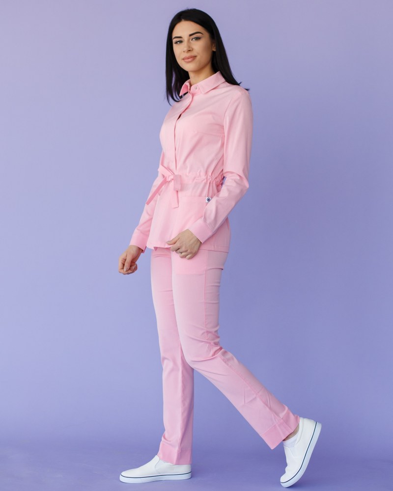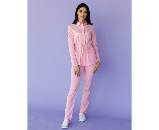 Медицинский костюм женский «Монтана» состоит из медицинской рубашки на кнопках и брюк. Рубашка имеет стояче-отложной воротник, который можно застегнуть под самый верх или же оставить неглубокое декольте, расстегнув несколько верхних кнопок. Есть два вместительных накладных кармана, а манжет рукавов фиксируется потайными кнопками. Пояс-кулиска подчёркивает линию талии и при этом не сковывает движения. Низ — брюки прямого фасона с эластичной резинкой на талии и двумя втачными карманами.