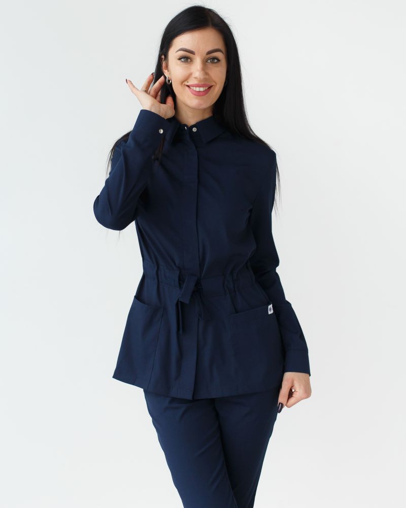 Медицинский костюм женский «Монтана» состоит из медицинской рубашки на кнопках и брюк. Рубашка имеет стояче-отложной воротник, который можно застегнуть под самый верх или же оставить неглубокое декольте, расстегнув несколько верхних кнопок. Есть два вместительных накладных кармана, а манжет рукавов фиксируется потайными кнопками. Пояс-кулиска подчёркивает линию талии и при этом не сковывает движения. Низ — брюки прямого фасона с эластичной резинкой на талии и двумя втачными карманами.