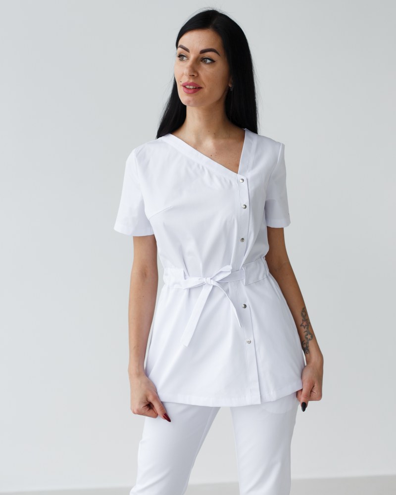 Костюм состоит из медицинской рубашки на кнопках и брюк. Рубашка имеет оригинальный ассиметричный вырез горловины, короткие рукава, застегивается на ряд кнопок. Талию подчеркивает пояс-кулиска. Низ — брюки прямого фасона с эластичной резинкой на талии и двумя втачными карманами. Удобный и стильный, костюм-двойка «Наоми» понравится не только практикующий медикам, но и представительницам beauty-индустрии.