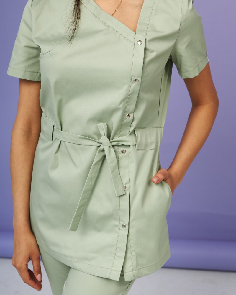 Костюм состоит из медицинской рубашки на кнопках и брюк. Рубашка имеет оригинальный ассиметричный вырез горловины, короткие рукава, застегивается на ряд кнопок. Талию подчеркивает пояс-кулиска. Низ — брюки прямого фасона с эластичной резинкой на талии и двумя втачными карманами. Удобный и стильный, костюм-двойка «Наоми» понравится не только практикующий медикам, но и представительницам beauty-индустрии.
