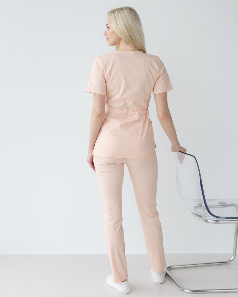 Костюм состоит из медицинской рубашки с коротким рукавом и зауженных штанов. Рубашка с имитацией запаха имеет пояс-завязку. Такой крой акцентирует фигуру, не ограничивая движения. Штаны на эластичной резинке дополнены вместительными карманами.