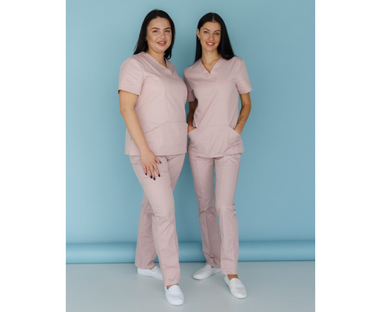 Женский хирургический костюм «Топаз» состоит из рубашки с короткими рукавами и штанов классического фасона. Медицинская рубашка полуприталенного кроя дополнена фигурным вырезом горловины. Она не сковывает движений и позволяет ощущать комофрт даже во время самой активной смены. На лицевой стороне рубашки медицинской женской «Топаз» расположился вместительный карман-кенгуру. Штаны медицинские женские от костюма «Топаз» — прямые, лицевая сторона декорирована строчками. Медицинские брюки женские от костюма имеют высокую линию талии, дополнены широкой эластичной резинкой, закрепленной параллельными швами.